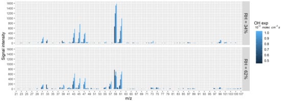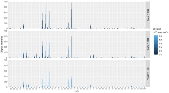 The results of dot products calculated between different OH exposure and RH were depicted as a correlogram in Figure 4. In general, most of the dot products between spectrums obtained under same RH but different OH exposures are very close to 1, as shown by the deep blue color boxes. One exceptional case was observed at RH = 17% with OH exposure of 0.40 × 1012 molec cm−3 s, which is the lowest OH exposure in the current study. The spectrum under this condition showed a decrease in dot product with increasing OH exposure, as depicted by the gradual change of color from deep blue to deep yellow. The above observations suggest that except for the lowest OH exposure in this study (OH exposure = 0.40 × 1012 cm−3 s), the OH exposure range investigated by our experiments is high enough to reach the “final stage” of gas-phase oxidation, and further increase in OH exposure will not change the gas-phase product compositions significantly. At OH exposure = 0.40 × 1012 cm−3 s, the oxidation reaction of toluene does not reach the “final stage”, and therefore its gas-phase product composition is different from other experimental conditions in the current study.
