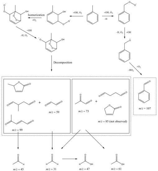 Figure 2 depicted the PTR-MS spectrum for the gas phase products observed in the three sets of experiments without seed particle. These spectrums were obtained by subtracting the spectrum at a certain OH exposure by the spectrum at OH exposure = 0 molec cm−3 s. Therefore, the spectrums shown in Figure 2 correspond to the products formed in the PAM OFR. Signals that were captured in all three spectrums in Figure 2 are m/z = 31, 43, 45, 47, 59, 61, 73, 99, and 107. By comparing the results with previous studies [31,32,33,34], the National Institute of Standards and Technology (NIST) database, and the Master Chemical Mechanism (MCM) version 3.3.1 database, the aforementioned peaks were assigned as formaldehyde (m/z = 31), acetyl radical (m/z = 43), acetaldehyde (m/z = 45), formic acid (m/z = 47), glyoxal (m/z = 59), acetic acid (m/z = 61), methyl glyoxal (m/z = 73), unsaturated carbonyls (m/z = 99), and benzaldehyde (m/z = 107). The proposed mechanism for the formation of these products were outlined in Figure 3. Benzaldehyde was produced through the abstraction of a methyl group hydrogen in toluene (route 2 in Figure 3), while other products were formed through the hydrogen abstraction from the benzene ring, resulting in the formation of a bicyclic peroxy radical. The bicyclic peroxy radical then decomposed to form two groups of first-generation products. The first group of products are glyoxal and unsaturated carbonyls with a molecular weight 98, and the second group of products are methyl glyoxal and unsaturated carbonyls with a molecular weight of 84. Further oxidation of the aforementioned first-generation products results in the production of acetaldehyde, formaldehyde, formic acid, and acetic acid. In the current study, the signal of m/z = 99 was very weak while signal of m/z = 85 was under detection limit. It has been shown in a previous study by Arey et al. [35] that the yields of unsaturated carbonyls were significantly lower than their smaller 1,2-dicarbonyl counterparts, which agree with the results of the current study. The weak signal of m/z = 99 and the absence of m/z = 85 signal showed that these unsaturated carbonyls may undergo rapid oxidation right after their formation in the PAM OFR. A rapid degradation of unsaturated carbonyls is also supported by the observation that spectrums depicted in Figure 2 were dominated by second generation products, which are the oxidation products of the unsaturated carbonyls.