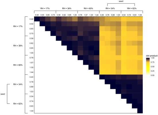 It has been reported in previous studies that RH will change the chemical composition of gas phase and particle phase oxidation products of different VOCs. The effect of RH on the chemical composition of gas phase products can again be examined by the dot products between experiments carried out at different RH as shown by Figure 4. In most of the cases, dot products between spectrums are larger than 0.9 with deep blue color, indicating great similarities between them. At the same time, it can be observed that dot products between RH = 17% (0.4) and other RHs are smaller than all other dot products in experiments without using seed particles. This observation can be explained by the effect of OH exposure as presented in the previous section. Therefore, in general, the effect of RH on gas-phase product compositions in the current study is minimal.