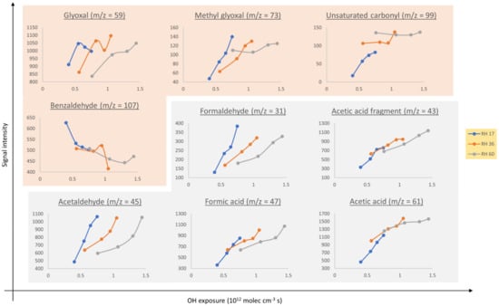 Changes in signal intensity of products observed by PTR-MS under different RH and OH exposure. Plots in light brown correspond to first generation products while plots in grey represents second generation products.