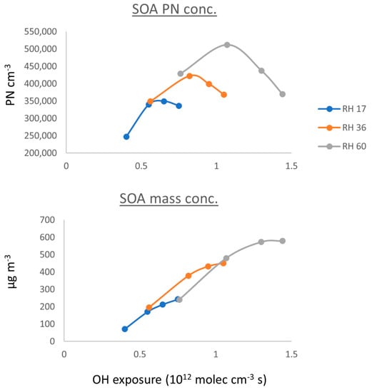 Changes of SOA particle number (PN) concentration and mass concentration under different RH and OH exposure.