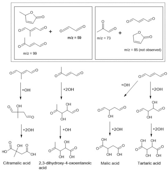 - Hamilton, J.F.; Lewis, A.C.; Reynolds, J.C.; Carpenter, L.J.; Lubben, A. Investigating the composition of organic aerosol resulting from cyclohexene ozonolysis: Low molecular weight and heterogeneous reaction products. Atmos. Chem. Phys. 2006, 6, 4973–4984. [Google Scholar] [CrossRef] [Green Version]