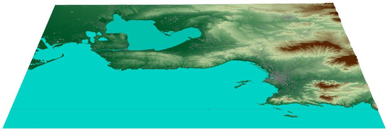 3D view of the topography and buildings for the Marseille domain. North is at the top.