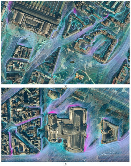 Closeup view of the flow streamlines computed in the streets near (a) the train station and (b) the museum. North is at the top.