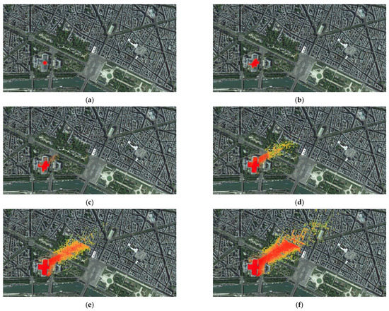 View, for the EMERGENCIES project, of the plume inside and in the vicinity of the museum: (a) 1 min after the release; (b) 3 min; (c) 4 min; (d) 6 min; (e) 8 min; (f) 10 min. The change from the 1-m resolution of the inner domain to the 3-m resolution of the large domain can be noticed. The threshold for 500 µg/m3 of concentration is in red, while that for 1 µg/m3 is in orange and that for 0.001 µg/m3 is in green. North is at the top.