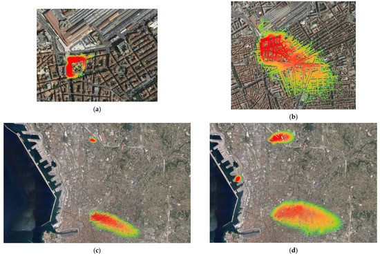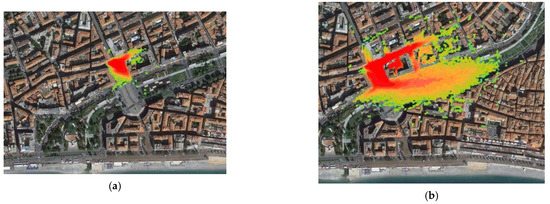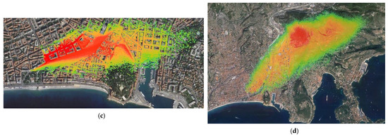 In Figure 10, for the multiple releases in the Marseille domain, various zoom levels allowed the global pattern of the plume to be displayed while being able to also focus on pollutant entrapment inside canyon streets.
