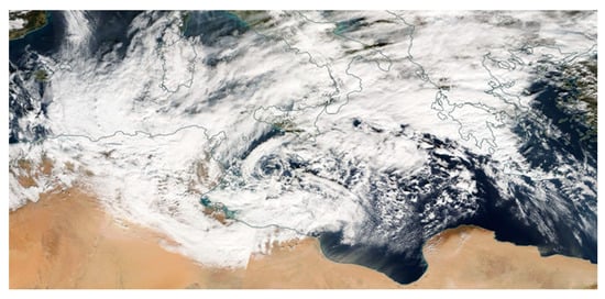 Satellite image of the medicane, on 14 December 2005. Terra/Modis imagery, taken from: https://worldview.earthdata.nasa.gov, (accessed on 27 April 2021) (NASA Worldview, EOSDIS).