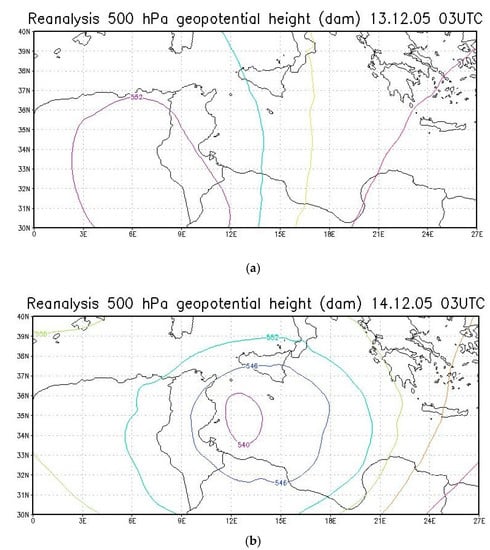 500 hPa geopotential height (dam) on: (a) 13 December 2005 03:00 UTC and (b) 14 December 2005 03:00 UTC [20].