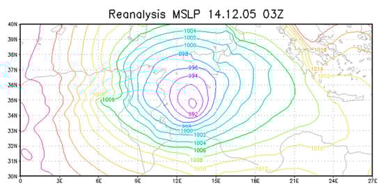 At the early stages an upper air, large cutoff low appeared at 500 hPa over northern Algeria with cold air advected from west Europe to the Mediterranean Sea and drier, warm air advected from north Africa, which produced a surface low over northern Libya on 12 December 2005 18:00 UTC with a central mean sea level pressure (MSLP) of 1009 hPa [4]. As the surface low began to deepen, a low-level warm core began to develop due to the warm advection from the south [4]. By 13 December 2005 at 03:00 UTC the cutoff, upper air low was well defined (Figure 2a) and the storm exhibited an axisymmetric structure. As the system moved to the northeast, the 500 hPa low intensified (Figure 2b) as did the surface low. The minimum MSLP of 989.6 hPa was attained at 03:00 UTC on 14 December 2005 (Figure 3). Maximum rainfall occurred during the morning of 13 December 2005 along a north-south cold front extending from Sicily to the coast of Libya (Figure 4) with maximum hourly values of more than 30 mm h−1 over Sicily [22]. By the evening of 13 December 2005, the rainfall around the storm center decayed significantly.