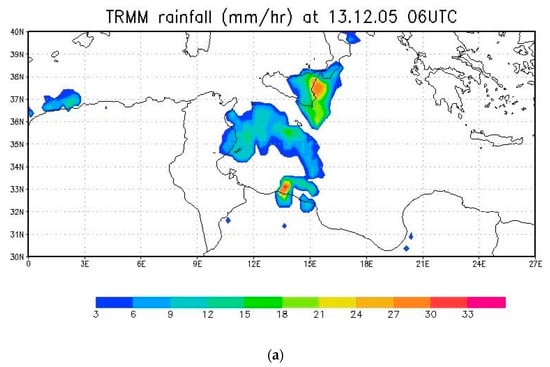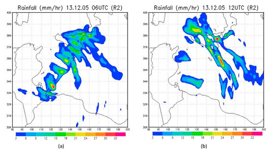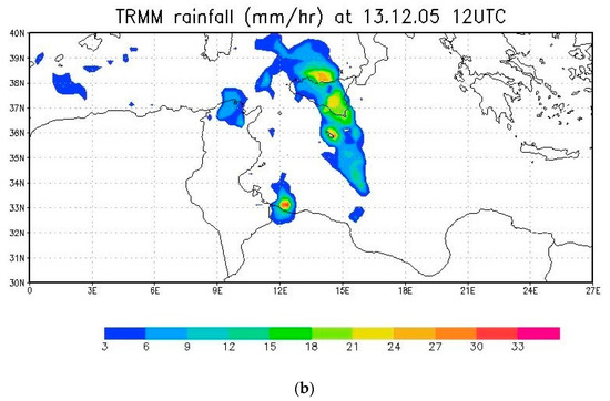 TRMM hourly rainfall rate (mm h−1) from (a) 13 December 2005 06:00 UTC and (b) 13 December 2005 12:00 UTC [22].