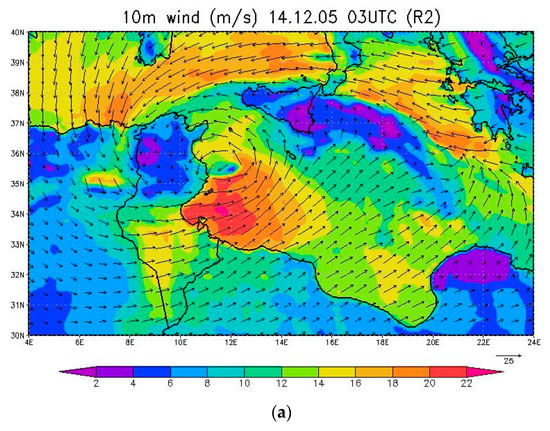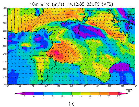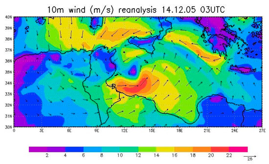 The 10 m wind at the time of the peak of the storm is shown in Figure 5 with maximum sustained wind speeds of 20–22 m s−1 along the southern flank of the low center along the coat of Libya (Figure 5). The strongest winds of 29 m s−1 (104 km h−1) were observed on 13 December 2005 17 UTC before the MSLP reached its lowest value [9]. On 14 December 2005 00 UTC, the TLC fronts clearly showed a T-bone structure following the Shapiro-Keyser cyclone model [9], where the cold front moves perpendicular to the warm front without touching and the gap between the fronts is filled by warmer air masses, thereby leading to the “hammerhead” T-bone structure [23].