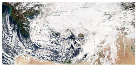 The explosive cyclone, on 11 December 2010—Terra/Modis imagery, taken from: https://worldview.earthdata.nasa.gov, (accessed 27 April 2021) (NASA Worldview, EOSDIS).