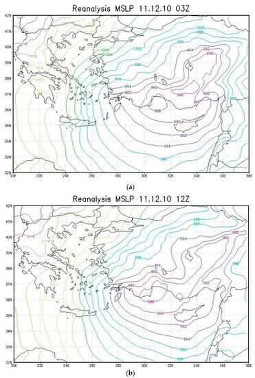 The storm became explosive as the sea level pressure dropped rapidly from 995.1 to 986.5 hPa between 10 December 2010 18 UTC and 11 December 2010 03 UTC, initially as it remained over the sea and then as the surface low moved over land to the northeast as shown in Figure 7a. The pressure drop of 8.6 hPa over 9 h was above the cutoff for explosive cyclogenesis at this latitude (8.1 hPa/12 h−1) with the primary low pressure center over Turkey. Subsequently the low-pressure center over land weakened and a secondary low developed over the 9 h over the Gulf of Antalya as shown by the MSLP map for 11 December 2010 12 UTC in Figure 7b with a minimum MSLP of 986.7 hPa. The transition from the primary low to the secondary low becoming dominant occurred between 09–12 UTC on 11 December 2010. Both low pressure centers were located within a large elliptical band that stretched northeastward from the gulf towards the Black Sea.