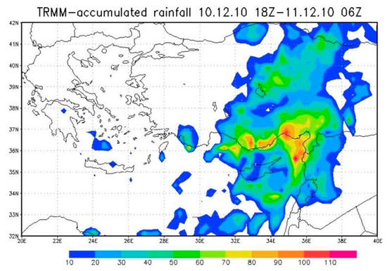TRMM—TRMM 12 h accumulated rainfall (mm) during the explosive cyclogenesis phase from 10 December 2010 18:00 UTC to 11 December 2010 06:00 UTC [22].