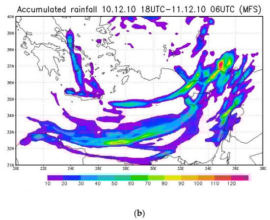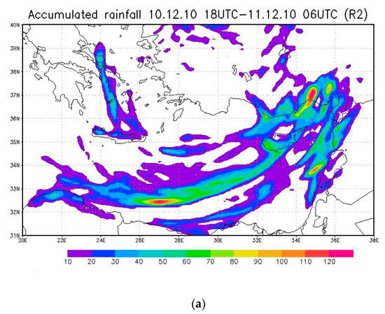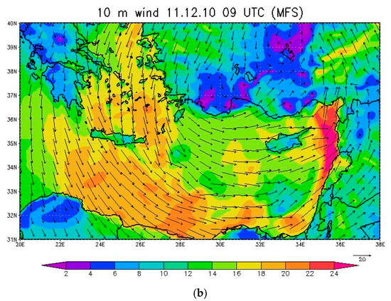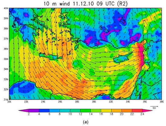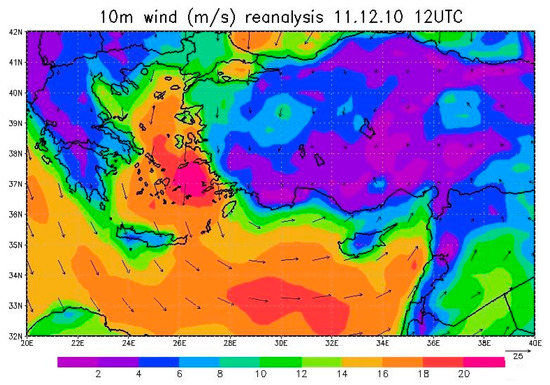 The 12 h accumulated rainfall during the explosive cyclogenesis phase is shown in Figure 8. The region of maximum rainfall appears in the northeast corner of the eastern Mediterranean, along the coast of Turkey to the north of Cyprus with a band extending southward along the eastern coast of the Mediterranean and a hint of some bands extending across the sea to the southwest. The 10 m winds at the time of the minimum MSLP of the secondary low, on 11 December 2010 12 UTC, are shown in Figure 9. Maximum sustained winds of 20–22 m s−1 occurred over the eastern Aegean Sea. The winds across the central Levantine basin with speeds over 18 m s−1 were responsible for the extremely high waves along the eastern coast of the basin.