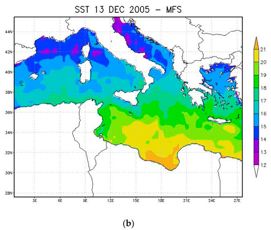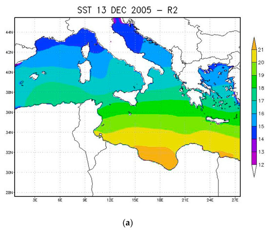SST (°C) fields on 13 December 2005: (a) from the R2 reanalysis and (b) from the Mediterranean Forecasting System (MFS) reanalysis for the full model domain.