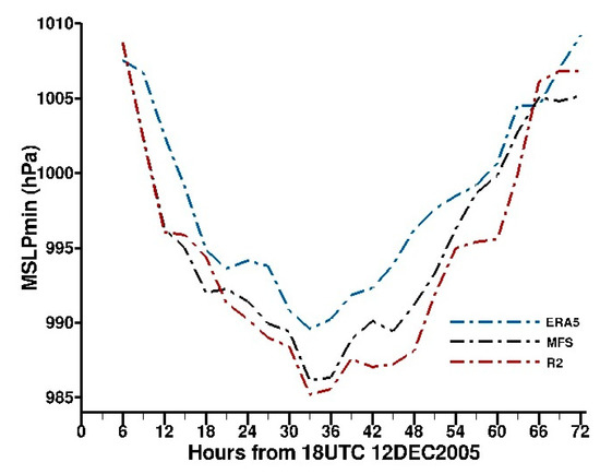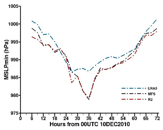 The time series plots of MSLP accounting for both the primary and secondary lows (over the Gulf of Antalya and near the Gulf of Iskenderun) for the ERA5 reanalysis, the R2 and the MFS runs from the storm’s formation to decay are shown in Figure 24. The model clearly favored the development of the primary low over Turkey while the ERA5 reanalysis showed that the intensities of the land based low and the secondary low over the Gulf of Antanlya were comparable (minimum MSLPs of 986.5 and 986.7 hPa, respectively) with the secondary low appearing 9 h later than the primary low. These two lows appear as relative minima in blue line of Figure 24 at 27 and 36 h, respectively. In both model runs, however, the low over Turkey is the main center of action. The difference of only 0.4 hPa between the two model simulations does not appear to be significant.