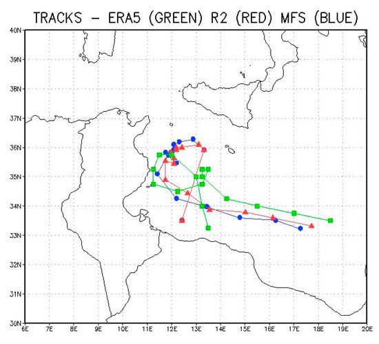 The storm tracks from both simulations for the period from 13 December 2005 00 UTC to 15 December 2005 00 UTC are shown in Figure 12. Since the shape of the TLC is fairly well defined, the track was determined by scanning for the lowest MSLP within a predefined ~600 km × 500 km box at each time step. The storm initially formed and remained nearly stationary over the southern Gulf of Gabès. It then moved northwestward towards the center of the Sicily channel where rapidly intensified and reached its peak between 03–06 UTC on 14 December 2005. As the storm slowly weakened it tracked southward back towards the Gulf of Gabès and then turned eastward towards the central Mediterranean. For comparison the track computed from the (coarser resolution) ERA5 reanalysis is shown. The main difference between the simulated and the reanalysis tracks occur during the early stage of intensification when the simulated TLCs move further north than observed. During the weakening phase the two simulated tracks are located slightly south of the reanalysis track. The mean track errors during the 18 h prior to the peak of the storm are 100 km and 103 km, respectively for the R2 and MFS runs. These values are somewhat higher than the mean values, but within the range of errors, obtained in other studies of TLCs which focused on better initialization of nowcasts [16] or various combinations of subgrid scale parameterizations [17,18]. During the intensification phase, the two simulated tracks were very similar with a mean difference of 13 km. They start to diverge after the peak of the storm with the R2 track generally located to the east-northeast of the MFS track. The largest difference between the tracks appeared during the six hours following the peak with values of up to 45 km.