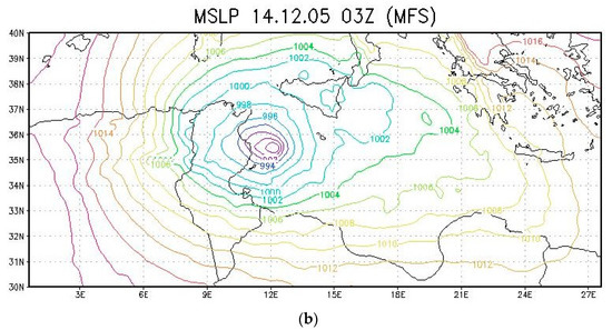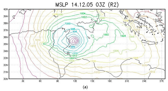 This TLC was initially identified on 12 December 2005 18 UTC over Libya as a very weak low-pressure center of about 1009 hPa when the SST was around 18–19 °C [9]. The storm deepened and attained its lowest mean sea level pressure value on 14 December 2005 03 UTC (Figure 1) and remained more or less stationary until 14 December 2005 16:00 UTC. It then moved to the east and crossed nearly the entire Mediterranean basin, while maintaining a low level, asymmetric warm core [9]. The storm decayed on 16 December 2005 over the Levantine basin [21].