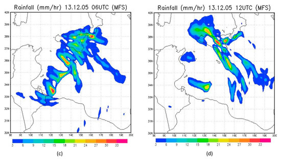 Hourly rainfall from the R2 run: (a) 13 December 2005 06 UTC, (b) 13 December 2005 12 UTC and from the MFS run: (c) 13 December 2005 06 UTC, (d) 13 December 2005 12 UTC.