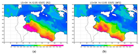 Latent heat + sensible heat fluxes (W/m*2) from (a) the R2 run and (b) the MFS run on 14 December 2005 03 UTC.