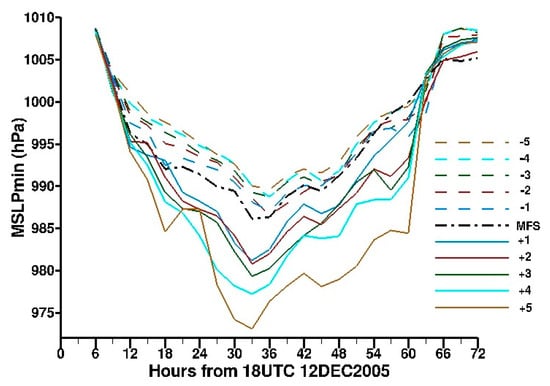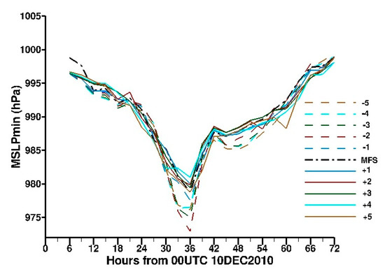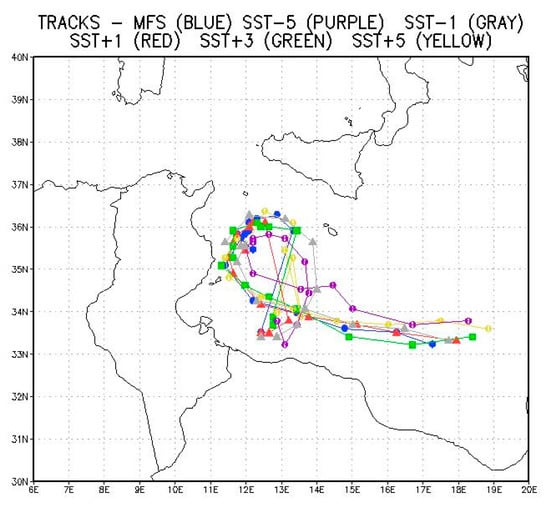As in the case of the TLC, here too we were interested in the sensitivity of explosive cyclogenesis to the warming trend observed in the SST of the Mediterranean [13] and the projected continued warming [31]. We therefore also ran a series of simulations with the MFS SST field increased by 1 °C increments up to a maximum increase of 5 °C, and for completeness we ran an additional set of simulations for comparable SST cooling scenarios.