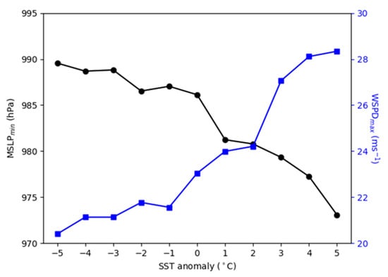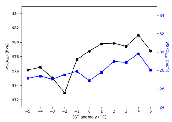 Minimum MSLP (black line) and maximum 10 m wind speed (blue line) at the time of the lowest central MSLP for all SST anomalies.