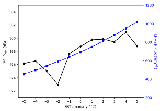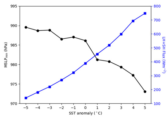Minimum MSLP (black line) at the time of the peak of the storm (lowest MSLP) and maximum 10 m wind speed (blue line) three hours before the peak for all SST anomalies.