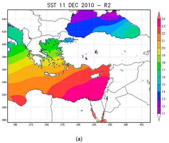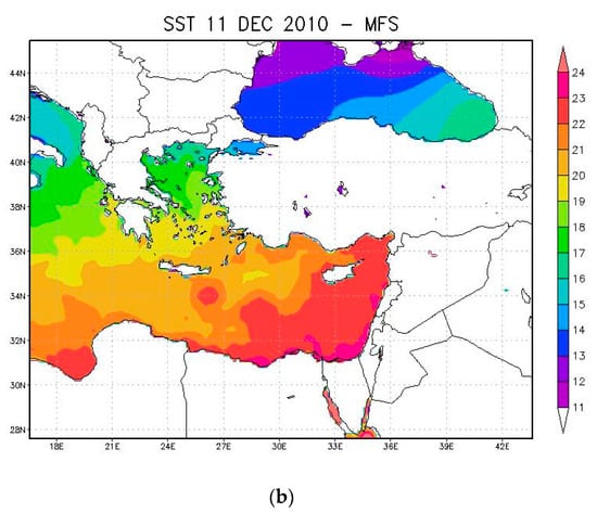 Both the R2 and MFS simulations were initialized on 10 December 2010 00 UTC. The lowest surface pressure in the center of the storm was reached 33–36 h later. The R2 and MFS SST fields for 11 December 2010 are shown in Figure 22a,b, respectively. A very noticeable patch of warm SST, referred to as the Ierapetra gyre, appears to the south/southeast of Crete in the MFS field. This feature is absent in the R2 SST field. With the exception of this region, the rest of the Levantine and Aegean seas are cooler in the MFS field. The average SST difference over the entire domain is −0.68 °C. Over the Aegean were the storm initially forms, the difference is only −0.08 °C.