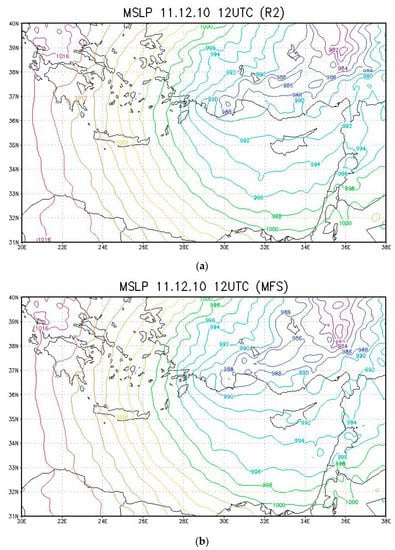 MSLP (hPa) at 11 December 2010 12 UTC (a) from the R2 run and (b) from the MFS run.