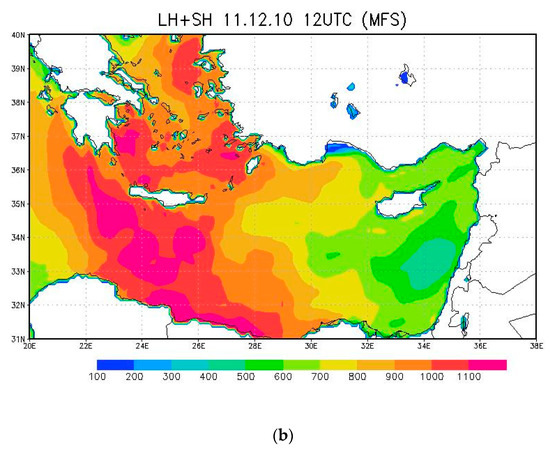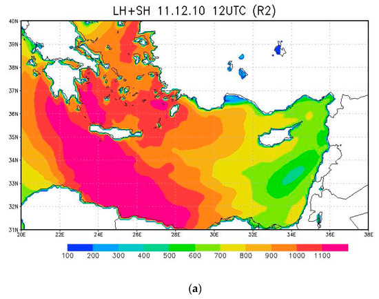 Finally, the turbulent heat flux (latent + sensible) over the sea at the peak of the simulated storm is shown in Figure 27. The highest values of over 1000 Wm−2 appear in the western Levantine basin covering the area between Crete and the coasts of Egypt and Libya. There are also several patches of high heat flux over the southern and northeastern Aegean Sea. The sensible heat flux accounts for less than 30% of the total turbulent heat flux across the Levantine basin, and for 30–40% of the total flux across the Aegean Sea. The R2 run shows slightly higher values than MFS run with a larger area covered by values over 1100 Wm−2.