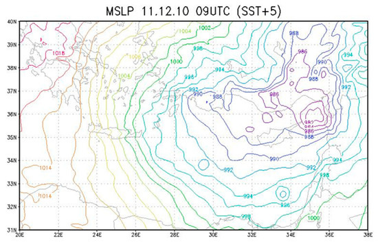 In December 2010 an explosive cyclone developed over the eastern Mediterranean. The surface low developed from a trough that extended from the northeast to the Aegean Sea. A closed isobar of 1002 hPa first appeared over the northern Aegean Sea on 10 December 2010 03UTC.The system tracked southeastward into southern Turkey and then eastward along the coast, attaining meteorological bomb status as it intensified over the Gulf of Antalya during 10–11 December 2010 (Figure 6). It then moved to the northeast while a secondary explosive cyclone formed over the same area [13]. The storm caused extremely high waves along the eastern coast of the Mediterranean with maximum significant wave heights of more than 7.5 m recorded off the coast of Haifa, Israel, which were the highest values measured over the past 30 years. SSTs off the coast of Turkey at that time were in the range of 20–22 °C suggesting that cold air advection from the north over the warm sea significantly contributed to the rapid intensification of the storm [10].