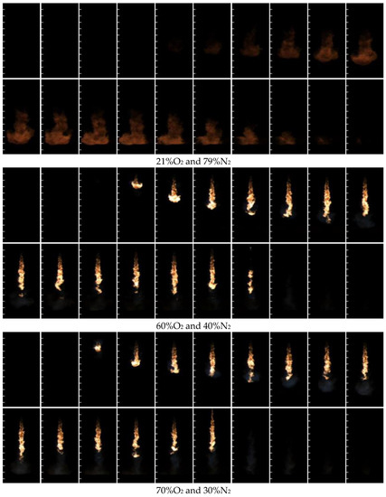 The constant volume combustion vessel test was carried out by increasing the O2 concentration to 30%, 40%, or 50% in a nitrogen-free environment, as shown in Figure 4. With the increase of the O2 concentration, the diesel-free ignition delay period was shortened by nearly 0.6 ms, and the combustion flame gradually became brighter. When the O2 concentration reached 30%, the combustion flame became obviously better, but it was still inferior to the air working condition, and was especially weak and discontinuous in the late combustion stage. When the oxygen concentration reached 40%, the combustion flame brightness was close to the air working condition. Additionally, its flame appearance became slender. It shows that the flame propagation speed increases as the O2 concentration rises. In particular, the flame in the 50% O2 condition is slender and bright, indicating that the nitrogen-free combustion in the 50% O2 concentration condition can continue and the combustion is perfect. The ignition delay period and combustion duration of the five combustion processes in each gas working condition were averaged and analyzed, as shown in Table 2. The standard deviation between the ignition delay period and the combustion duration of each working condition is about 1.5 ms, indicating that the data are stable. In working conditions of 21%, 30%, 40%, and 50% O2, the non-nitrogen ignition delay period is 2.01, 1.59, 1.46, and 1.18 ms, respectively. Therefore, the ignition delay period is mainly affected by the O2 concentration in the environment. The combustion duration was shortened from 3.2 to 2.7 ms.