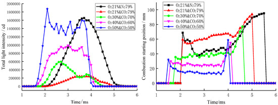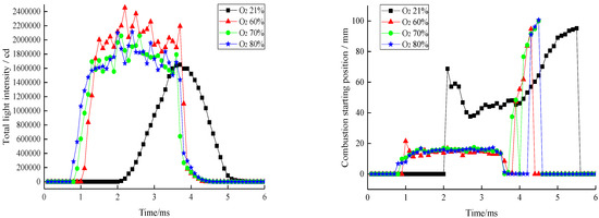 In order to quantitatively analyze the combustion process, data of the total light intensity, combustion start position (the distance between the first burning flame and the injector nozzle), ignition delay period, and duration are shown in Figure 3 and Table 1 by processing the photos. The increase in total light intensity under low-nitrogen conditions advances, and the steep curve indicates that the rate of rise is much faster than the air condition. The maximum light intensity under low-nitrogen conditions is slightly larger than that of air, and the maximum intensity of light intensity lasts longer than 2 ms. The flat-top curve is strikingly different from the singe-peak curve of the air working condition. The reason is that the concentration of O2 in the combustion environment rises greatly, which is beneficial to the ignition and combustion of diesel fuel. As a result, the combustion propagation speed accelerates, and the efficiency improves. The high-efficiency combustion in the early stage of low-nitrogen combustion accelerated the consumption of diesel fuel, resulting in a decrease in the amount of diesel in the late combustion stage, which causes the sharp fall in total light intensity, rather than a slow decline in the air condition. It is worth noting that the total intensity of light at the same time as low-nitrogen combustion conditions does not increase with the rise of the O2 concentration. The total intensity of light under 70% or 80% O2 concentrations are lower than 60%. The main reason for this phenomenon is that when the O2 concentration reaches a certain value, the combustion condition of diesel reaches the limit. This phenomenon is caused by thermal-physical differences between O2 and N2.