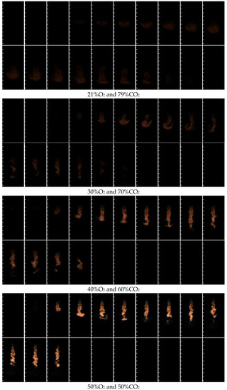 Although the diesel combustion time of 21% O2 and 79% CO2 was close to the air condition, the distance between the combustion flame and the injector nozzle was obviously larger than the air condition. When the O2 concentration increased to 30%, the start position of the combustion flame was similar to the air condition. When the O2 concentration was less than 30% at the middle stage of the nitrogen-free combustion, the combustion flame gradually moved down as the combustion processed, which was consistent with the air condition, as shown in Figure 5. The O2 concentration of the 40% and 50% nitrogen-free combustion flame start position will stay at a certain position. Especially, the nitrogen-free combustion condition of the 50% working condition is close to the low-nitrogen combustion condition. The combustion flame starts to stay at the position that is less than 20 mm from the injector nozzle.