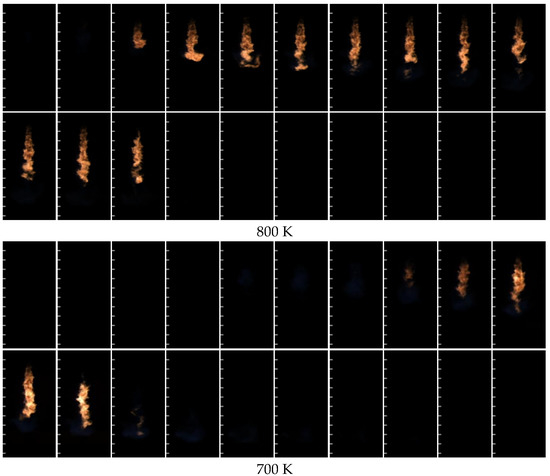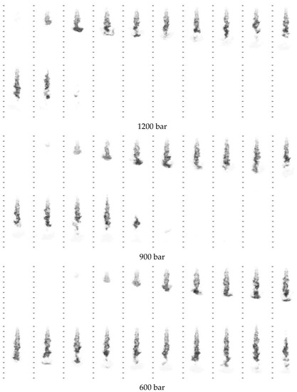 The constant volume combustion vessel test was carried out by replacing the N2 (21% O2 and 79% CO2) in the air with CO2. As shown in Figure 4, the first photo of each working condition was taken at 1.6 ms after the injection. Compared with Figure 3, although the combustion time is not much different from the air condition (about 2.1 ms), the combustion flame was very dark and the flame shape was slightly smaller. It indicates that the presence of a great deal of CO2 inhibits the combustion chemical reaction that produces CO2, thereby inhibiting the combustion process. Additionally, the CO2 heat transfer performance is much lower than that of N2, which weakens the flame propagation. This test indicates that diesel undergoes a chemical reaction in a 21% O2 and 79% CO2 environment.