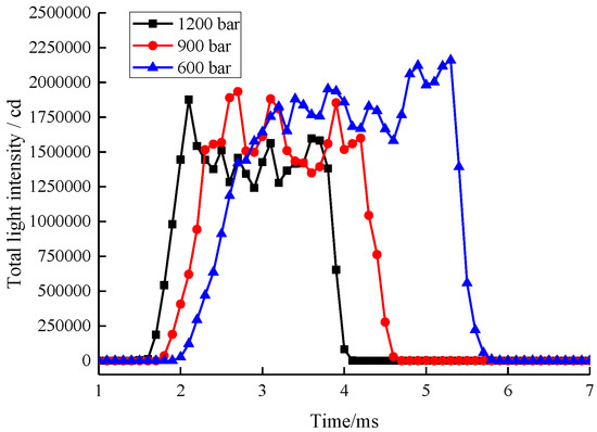 A large number of studies have shown that the injection pressure directly affects the progress of combustion [34,40]. This is true of the conclusion drawn from the optimization experiment of a constant volume combustion vessel without nitrogen combustion. As shown in Figure 7, in the nitrogen-free environment of 50% O2 and 50% CO2, the diesel fuel was injected at a pressure of 1200, 900, and 600 bar, respectively, and photos were taken of the combustion flame in a constant volume combustion vessel. The first picture of each working condition was the 16th shot after the injection, and the later interval was 0.2 ms. From the perspective of flame topography, there is not much difference. As the injection pressure decreased, the combustion time was obviously shifted back (1.5, 1.7, 1.9 and ms, respectively), and the combustion duration was extended (corresponding to 2.7, 3.1, and 4.0 ms, respectively). For the total intensity of the light and the starting position of the flame at different times, the analysis of the photograph was obtained, as shown in Figure 8. The change of the injection pressure does not affect the curve shape of the flat-top total intensity, and during the earlier and later period, the rise or drop rates of the total intensity of the light are similar. With the decrease of injection pressure, the maximum total light intensity was higher, and the change was not obvious. However, the increase of the injection pressure led to advancement of the diesel free-nitrogen combustion time, which can significantly improve the ignition performance. The authors of [34] used a Dongfeng 4135 ACa diesel engine, and its injection pressure was only about 300 bar, which is one of the key factors that led to poor combustion of the diesel engine under the nitrogen-free working condition of 50% O2 and 50% CO2. The above information implies that the diesel injection pressure is also critical for the diesel engine’s nitrogen-free combustion ignition performance. It is recommended to use a higher diesel injection pressure in later studies related to nitrogen-free combustion to optimize its ignition and combustion performance.