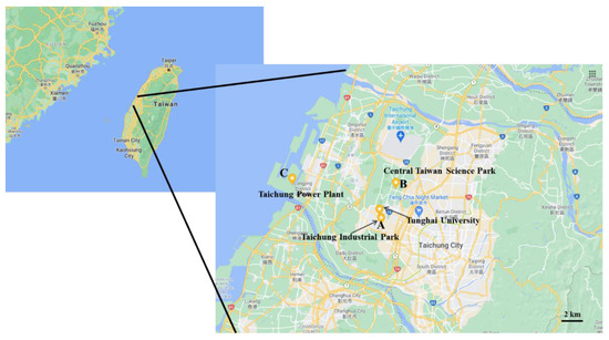 Schematic diagram of sampling site (Tunghai University) and the surrounding pollution sources (A: Taichung Industrial Park; B: Central Taiwan Science Park; C: Taichung Power Plant). The figure is reproduced from Google map at 24°10′54.1″ N 120°36′24.7″ E.