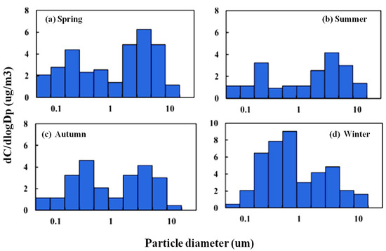 Particle size distributions: (a) Spring; (b) Summer; (c) Autumn; (d) Winter.