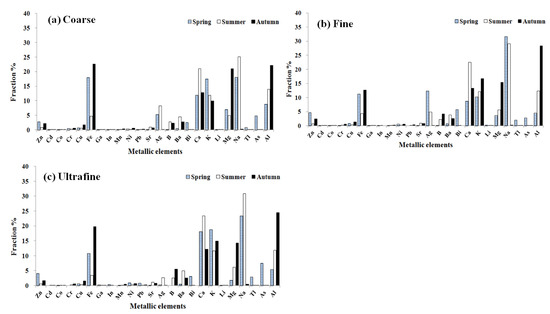 The fraction of metallic elements in different seasons (a): Coarse particles; (b): Fine particles; (c): Ultrafine particles.