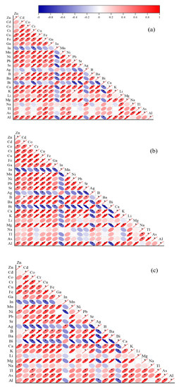 Correlations among metal elements for (a) coarse, (b) fine, and (c) ultrafine particles in sampling periods. *: p ≤ 0.05.