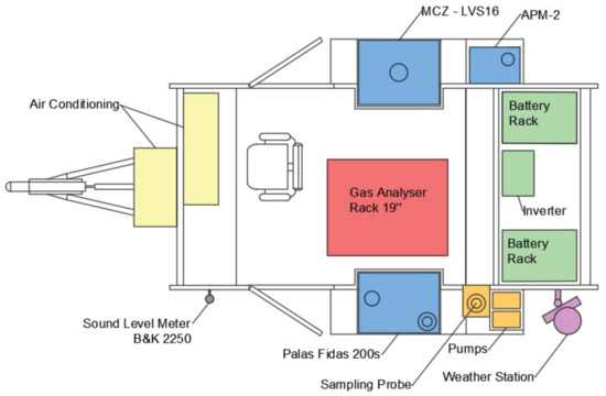 The mobile laboratory was built in a Ranger Hero Camper (length: 4.82 m; width: 2.3 m; height: 2.32 m). The internal volume of about 6 m3 is large enough to host all the selected instruments, even if an accurate placement study was needed (Figure 1). Nevertheless, thanks to its small dimensions, it can easily be moved or parked in almost any place. The frame and the off-road tires allow it to reach dirt tracks or isolated areas, which are not generally examined by the other, traditional moving laboratories.