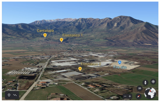 Immediate-response air quality monitoring was carried out during an emergency situation in which an industrial site caught fire. The intervention was demanded by the local municipality and had to meet their requirements in addition to the conventional sampling points of public agencies. The study (5 April 2019–13 May 2019) was performed in two areas in Piedmont (Italy), at the foot of the Alps, with the aim of studying the phenomena in order to justify the hazes observed by the citizens, although the public institutions reported concentration values lower than limits. In fact, an assessment of the fire development and of the effects of boundary conditions on the daily variability of haze and pollutant concentrations was conducted with high frequency measurements. An APM-2 analyser was used to determine PM2.5 and PM10 trends, initially at a distance of about 3.7 km (days 1–2: Cantalupa) from the burnt site, as shown in Figure 2. Then, the instrument was progressively moved closer to the industrial area (2.2 km, days 3–8: Frossasco 1; 200 m, days 8–40: Frossasco 2).