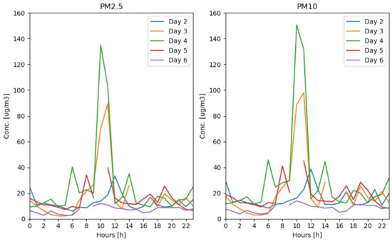 PM2.5 and PM10 daily trends for the Cantalupa (day 2) and Frossasco (days 3–6) monitoring campaigns. The graphs highlight a predominant peak in the temporal range 10 AM–1 PM.
