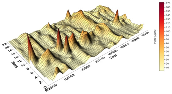 Another purpose of the APM-2 campaigns was achieved at the mountain site of Salbertrand (Alps, Piedmont, Italy—coordinates: 45.070964, 6.887413). The area was supervised to detect the influence of an anthropic source on the PM local distribution. In fact, a wide area close to the monitoring point was designated for the activities of sand and aggregate industries, with a huge material handling. The instrument was placed at a location about 600 m from this area for 5 weeks (25 September 2020–2 November 2020). The extremely high time resolution of the analyser made it possible to accurately assess the concentration distribution during the day. Figure 4 shows the PM10 trend of the entire period. The working activities had a strong influence on the coarser PM fraction, resulting in a repeated morning peak caused by the particle suspension.