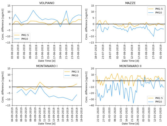 Differences between the data acquired by the two APM-2s in the external sites and the fixed urban station located in Politecnico di Torino (Turin, Italy). An almost null trend for PM2.5 delta was obtained. The PM10 trend was affected more by the local situation. PM10 suburban station values were generally lower than the fixed one, but the Volpiano campaign presented an opposite trend because of boundary conditions.
