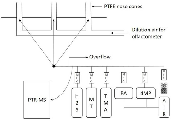 Schematic drawing of gas dilution system and connection to the olfactometer. H2S: Hydrogen sulfide; MT: methanethiol; TMA: trimethylamine; BA: butanoic acid; 4MP: 4-methylphenol; PTR-MS: Proton-Transfer-Reaction Mass Spectrometry; MFC: mass flow controller.