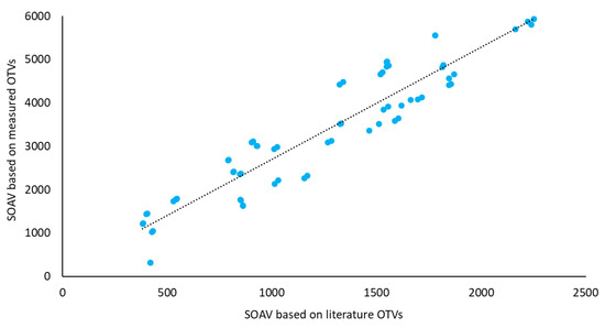 Correlation between sums of odor activity values (SOAV) based on measured and literature odor threshold values (OTVs) [23]. SOAVmeasured = 2.59 SOAVliterature + 107, R2 = 0.88.