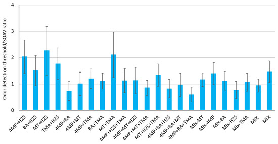 Odor detection threshold/SOAV ratio with 95% confidence intervals. H2S: Hydrogen sulfide; MT: methanethiol; TMA: trimethylamine; BA: butanoic acid; 4MP: 4-methylphenol.