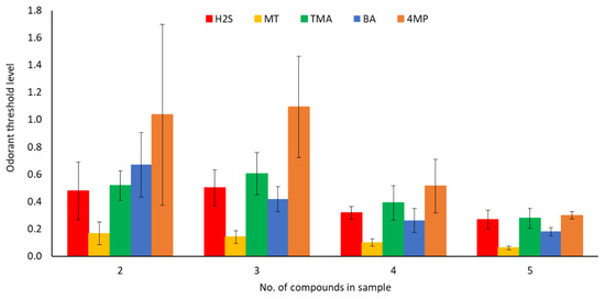 Odorant threshold level of odorants in samples with two to five odorants, mean ± standard deviation (SD). H2S: Hydrogen sulfide; MT: methanethiol; TMA: trimethylamine; BA: butanoic acid; 4MP: 4-methylphenol.